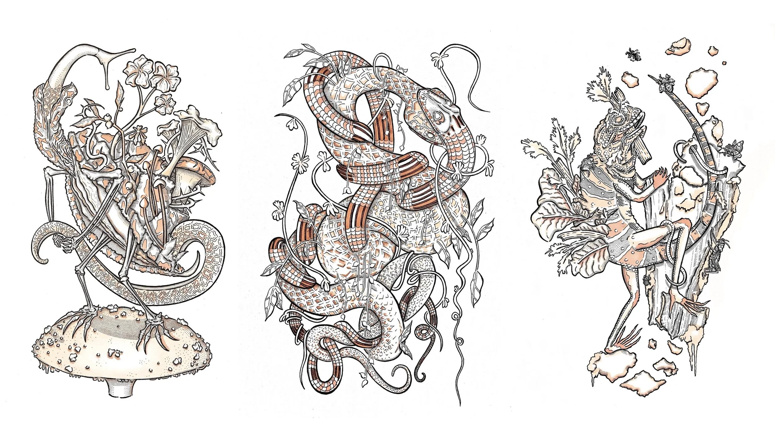 With titles embracing a ‘hickerbilly’ interpretation of the physical man-handling of food, “Human Reflux” is a three-part set of drawings focused on Missouri reptiles that are visually manipulated and exaggerated to emphasize the awareness of mindless consumption within the living world.